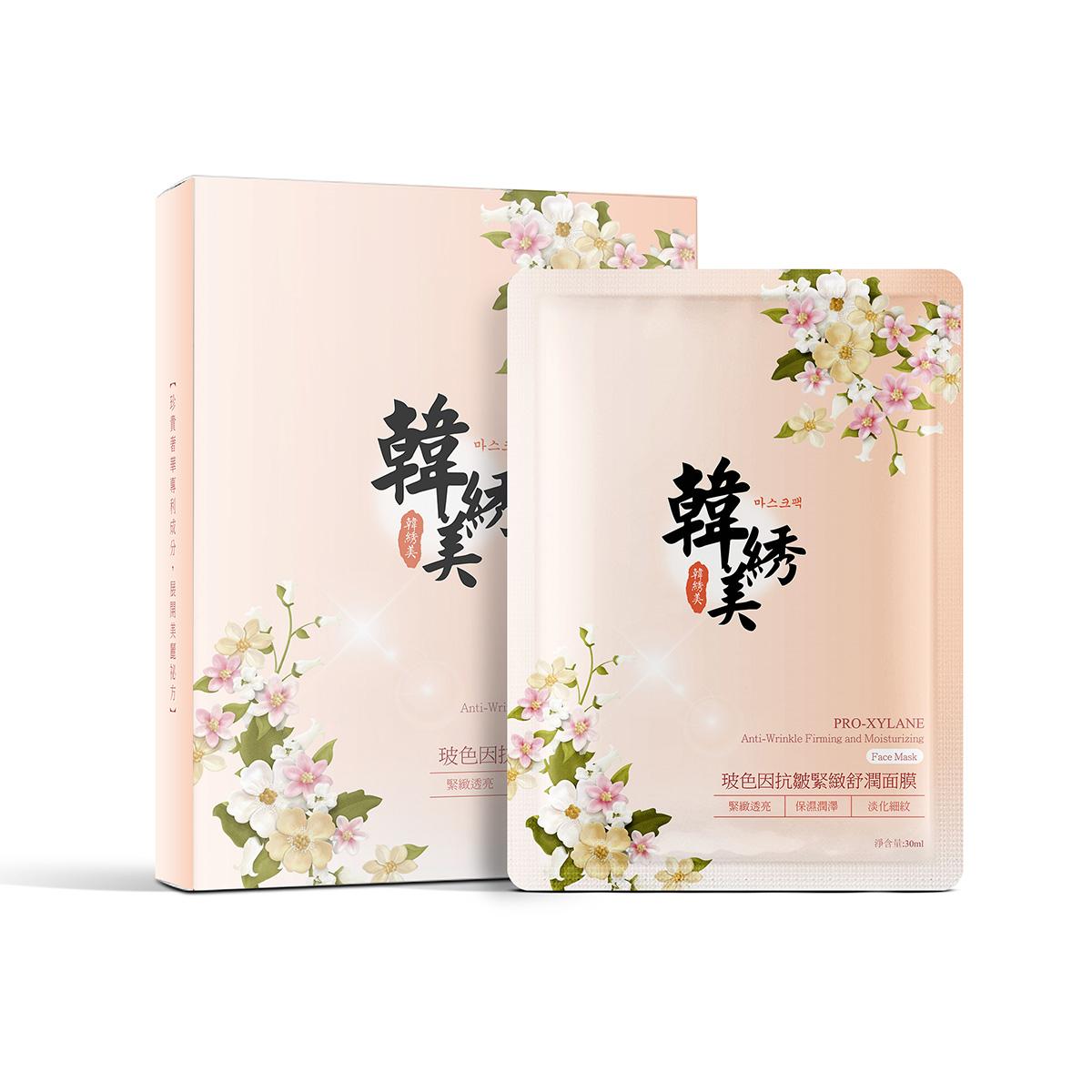 韓綉美玻色因抗皺緊致舒潤面膜,針對乾燥、缺水、老化等肌膚問題,韓國配方,蘊含玻色因珍貴成份,可以解決大部份肌膚老化問題。波色因能使肌膚變得緊緻、飽滿、彈潤,促進膠原蛋白的生成,長期使用能改善細紋,修護肌膚及預防衰老。 面膜質地輕薄透氣,可以讓你補充肌膚水分,令肌膚緊致透亮。