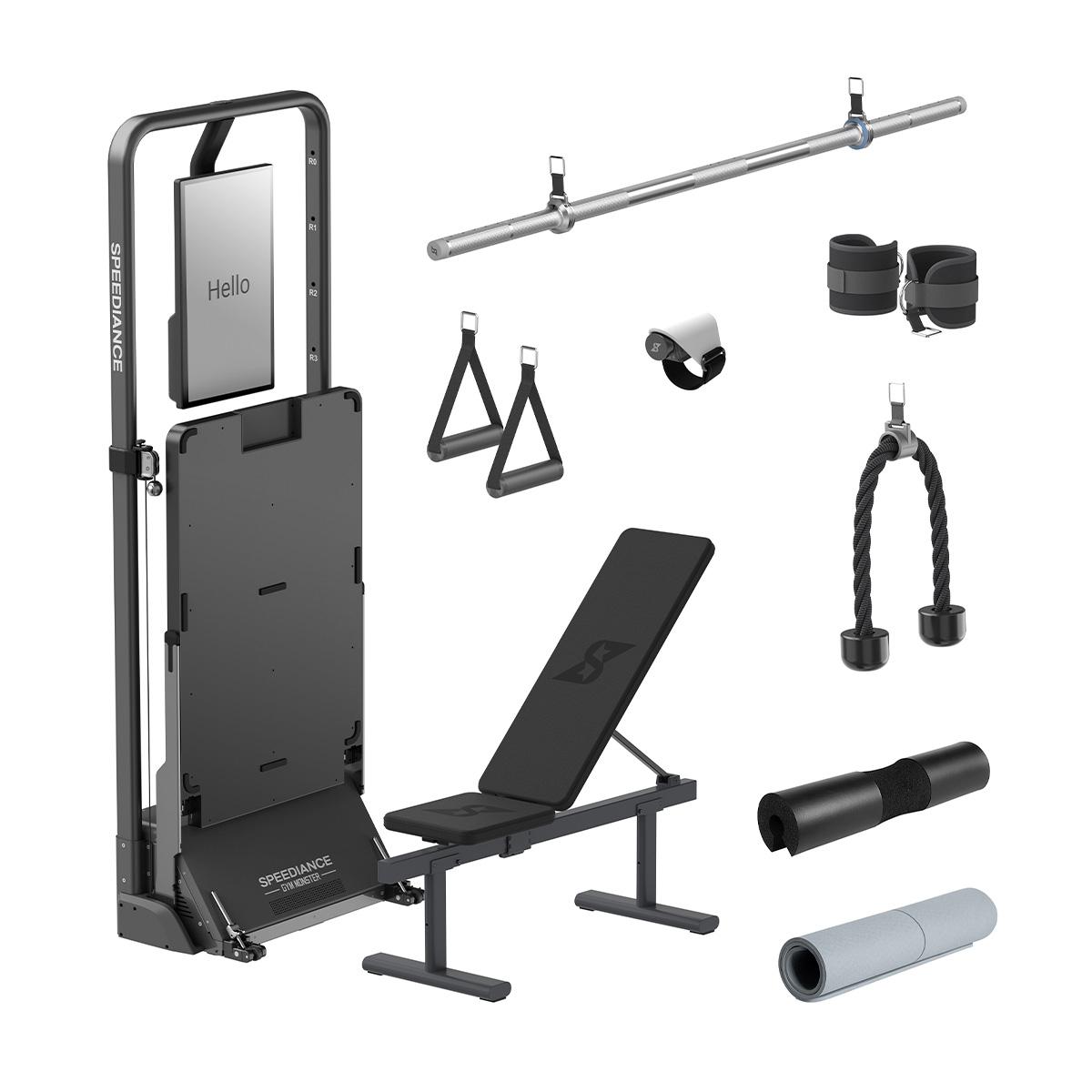 第二代Speediance智能健身室2.0 PRO帶來全新配件、全新體驗,令你訓練更加得心應手!透過接駁「藍牙指環」便能輕鬆開始/暫停訓練、以及調整重量。「可調節槓鈴桿」首創24孔「握距」調節,長度加至1.2米,無論任何姿勢、不同肩寬都可以自由訓練無障礙。亦可根據自己握桿習慣,自行調節鎖扣位置,確保兩端對稱。全新「可折疊健身椅」不但方便收納,而且可以調較不同角度,最大可以調較至90度,不論進行臥推或肩推都可輕易轉換。