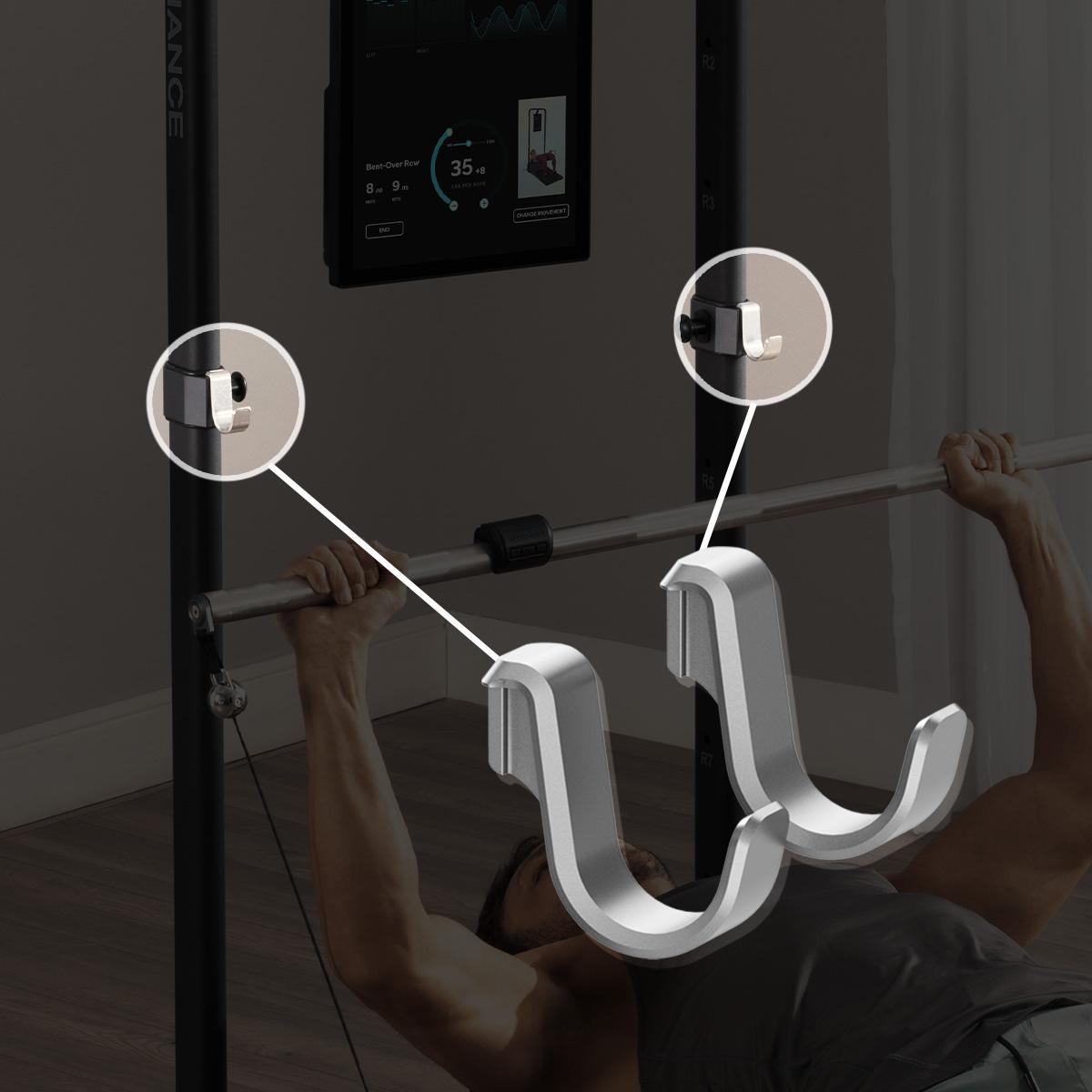 Speediance智能健身室槓鈴桿掛鉤配件扣上即用,配合深蹲、卧推/上斜卧推和頸部推舉等鍛鍊,讓你的訓練更舒適及安全。