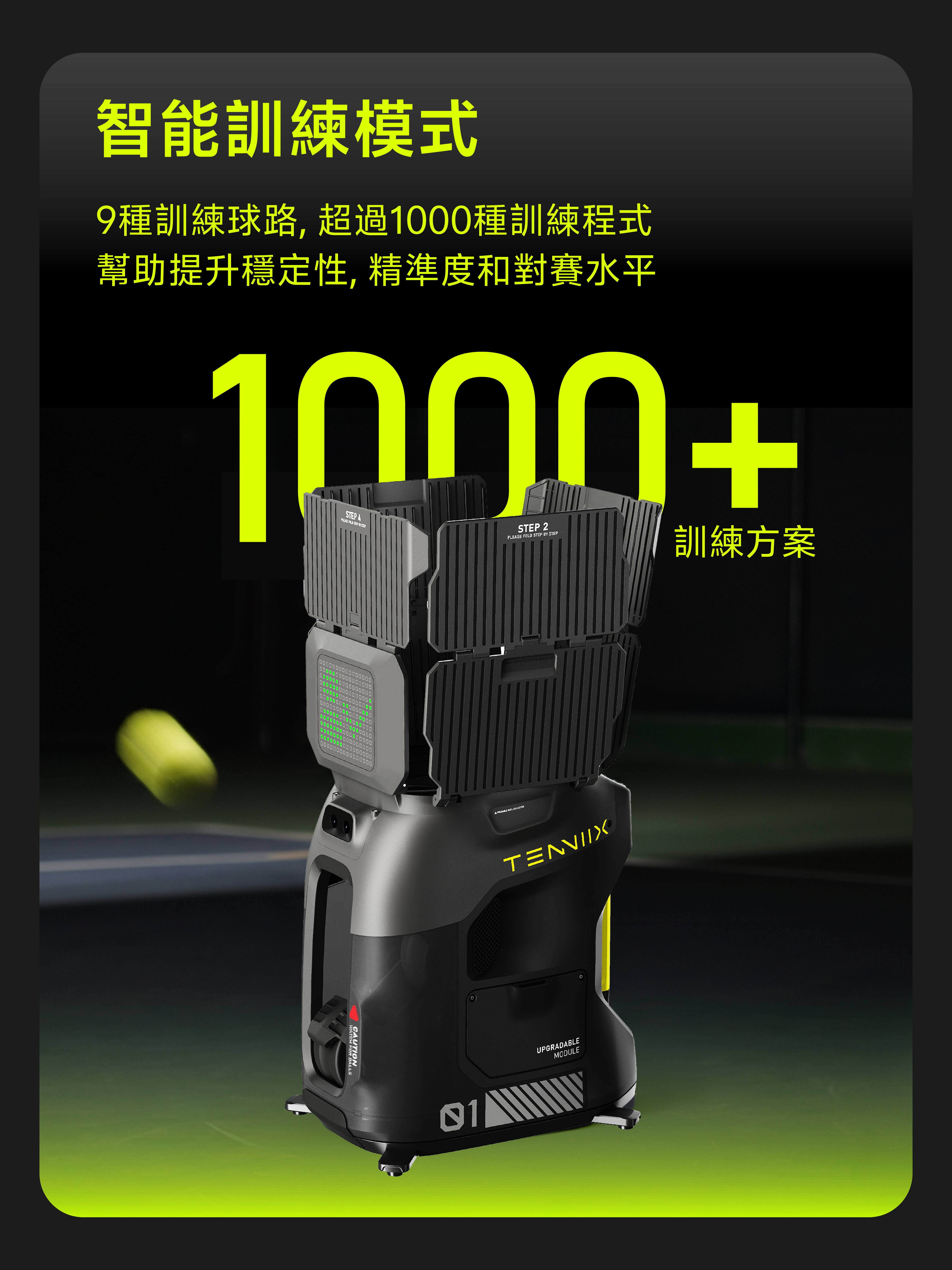 透過專屬App,隨時隨地調整速度、旋轉、落點與自訂訓練流程。支援線上更新,功能持續進化,讓你的訓練永遠跟上最新水準。