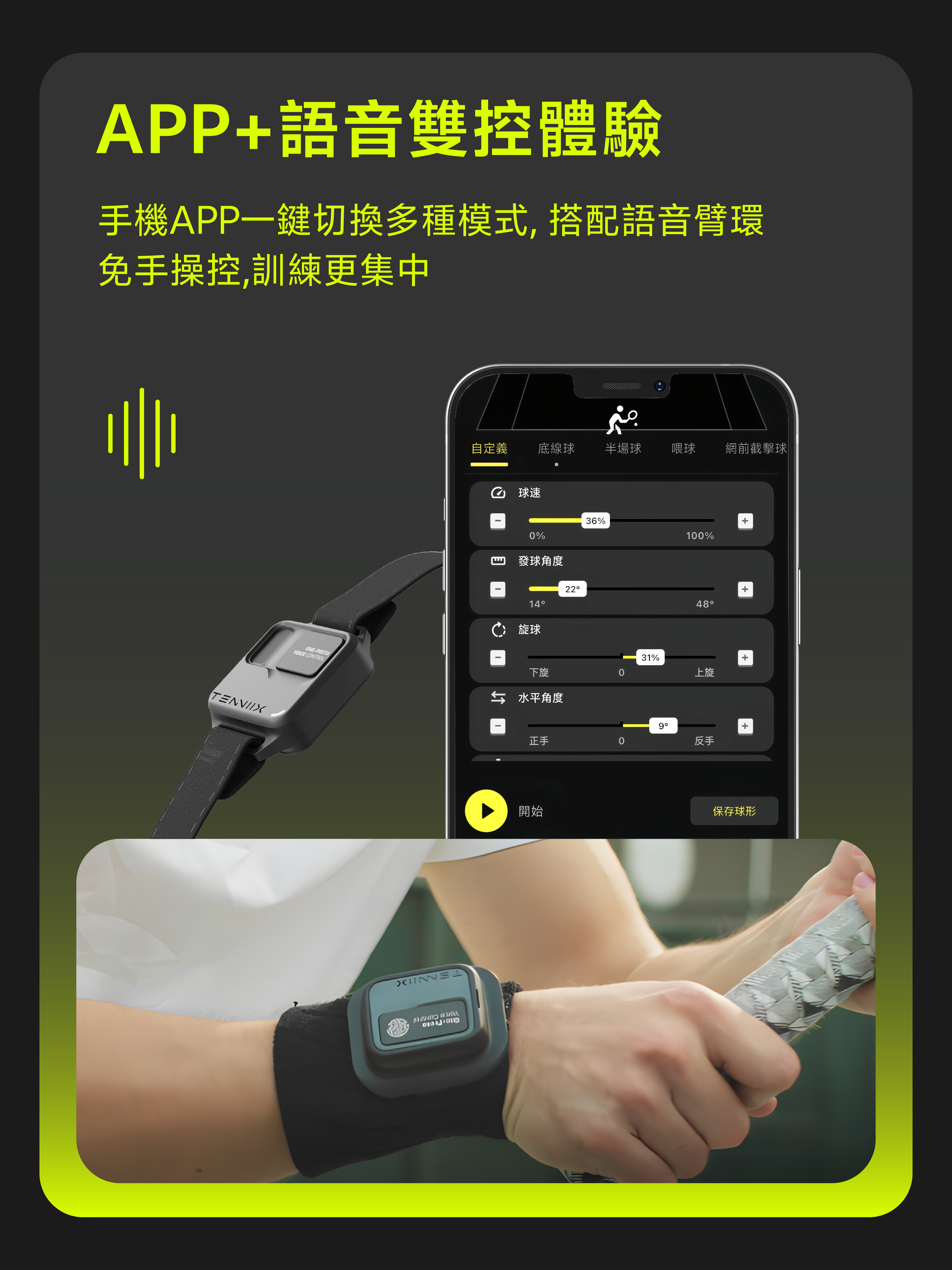 輕鬆語音喚醒只需「Hi Tenniix」,簡單語音指令如「serve fast」或「spin more」,機器立即執行,並透過語音及 LED 燈給予即時確認與回饋,讓訓練更流暢、更專注。