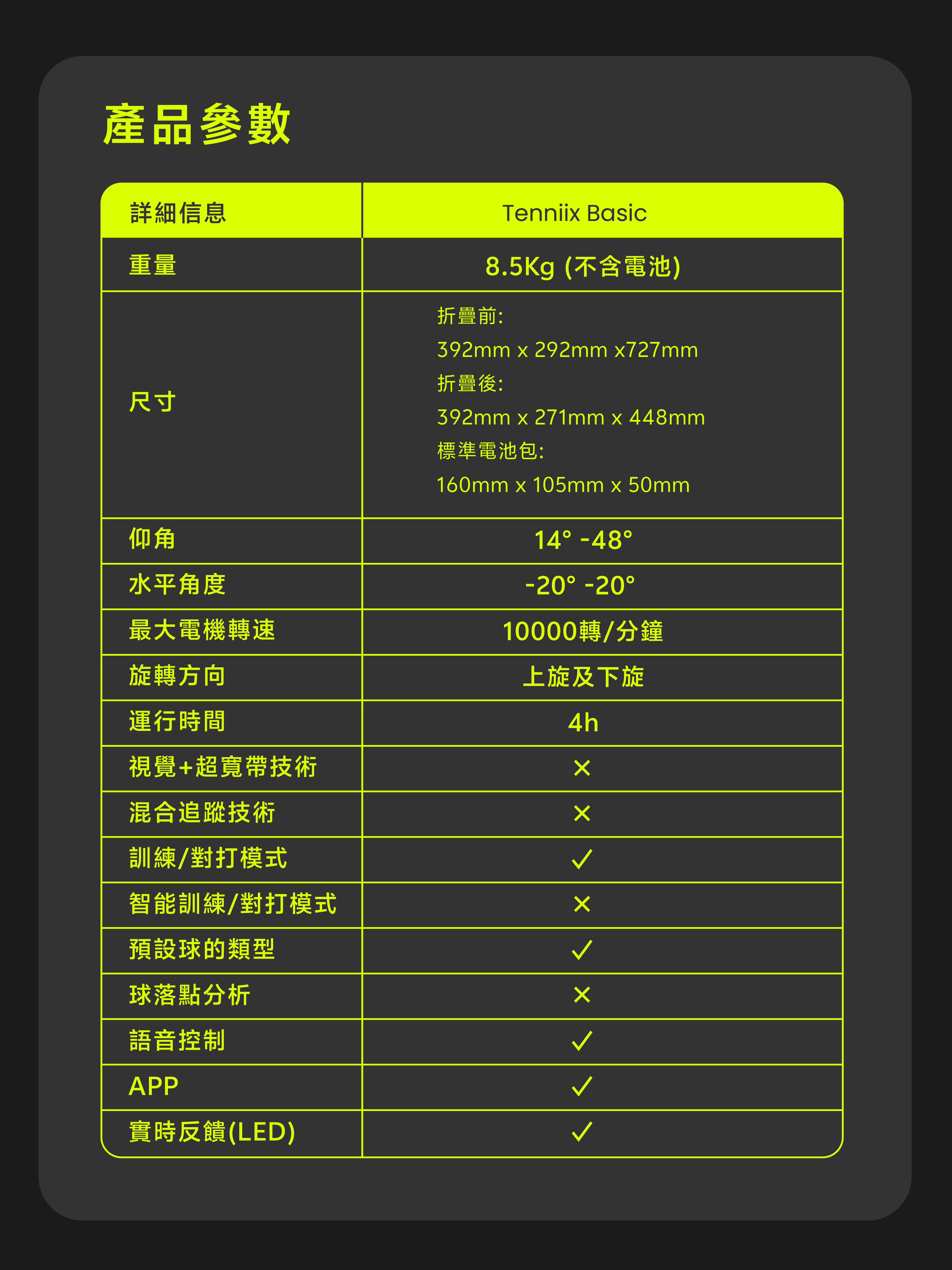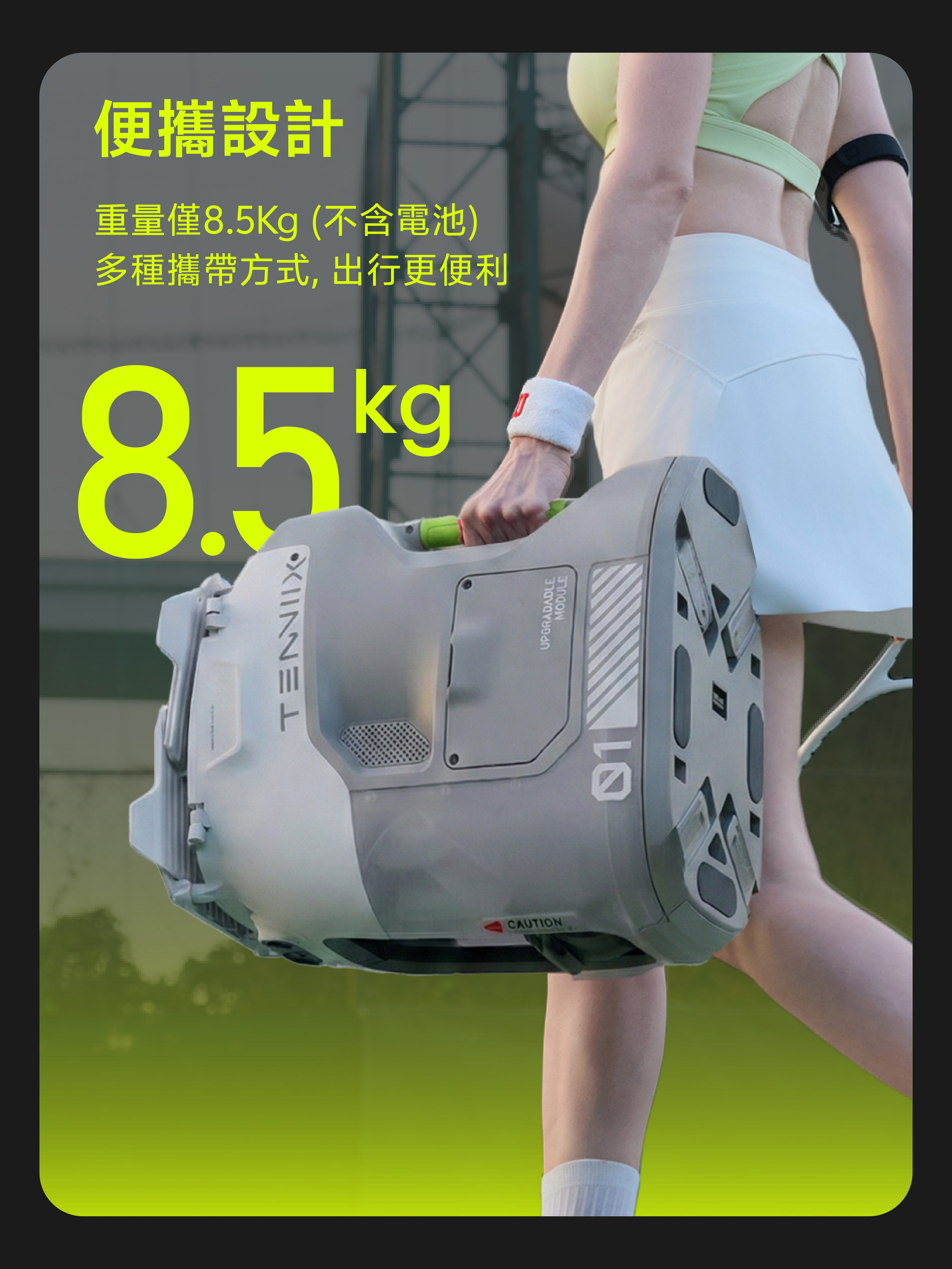 整機僅重約18.7磅(約8.5公斤),配可換電池,單次充電可連續使用 4小時。輕鬆放入後車廂,無論公園、球場或室內空間,2分鐘快速設置即可開始練習,徹底擺脫傳統笨重發球機的限制。