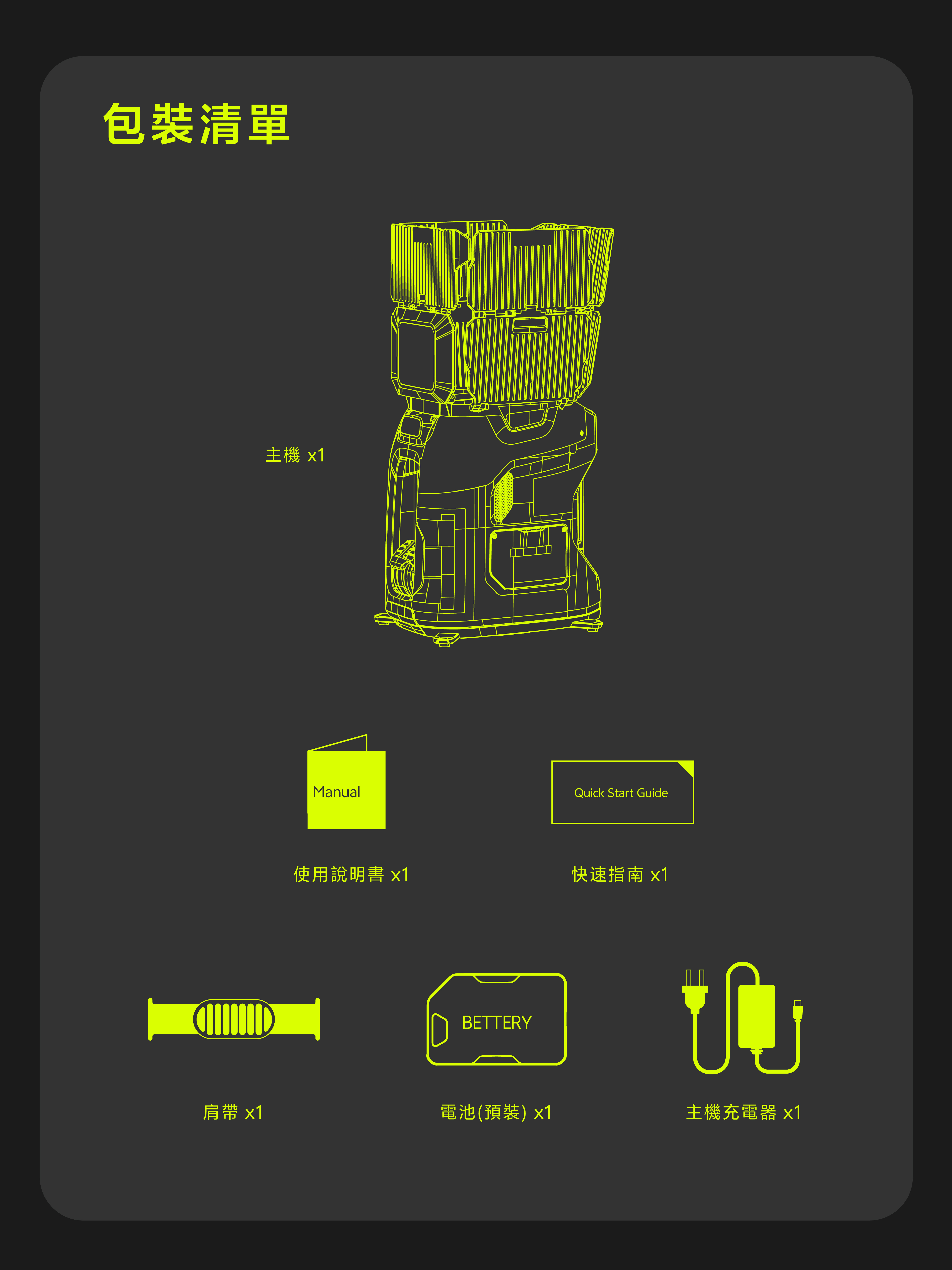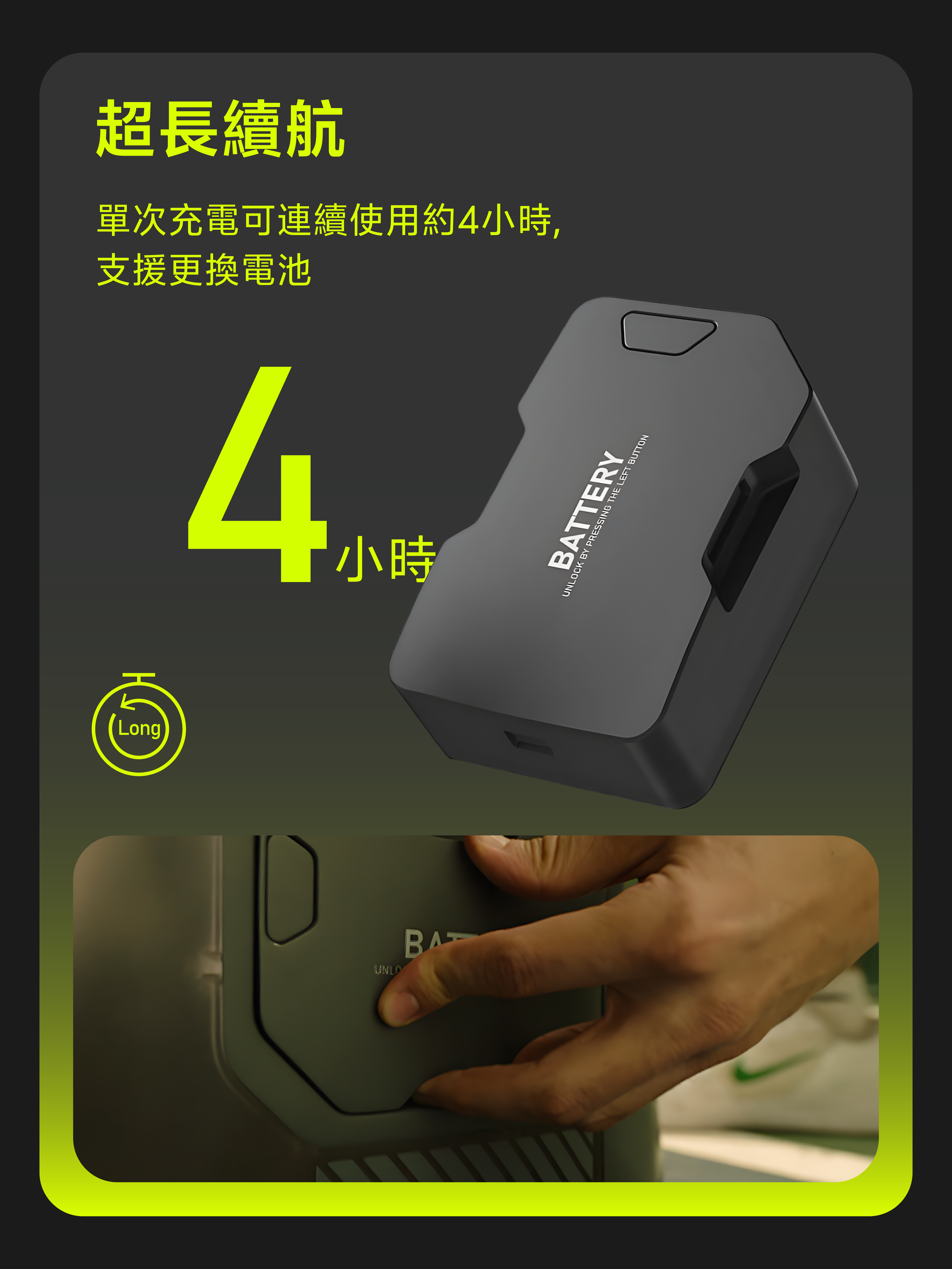 • 存放環境:長期閒置時請取出電池,主機與電池分開存放於乾燥通風處,避免陽光直射。